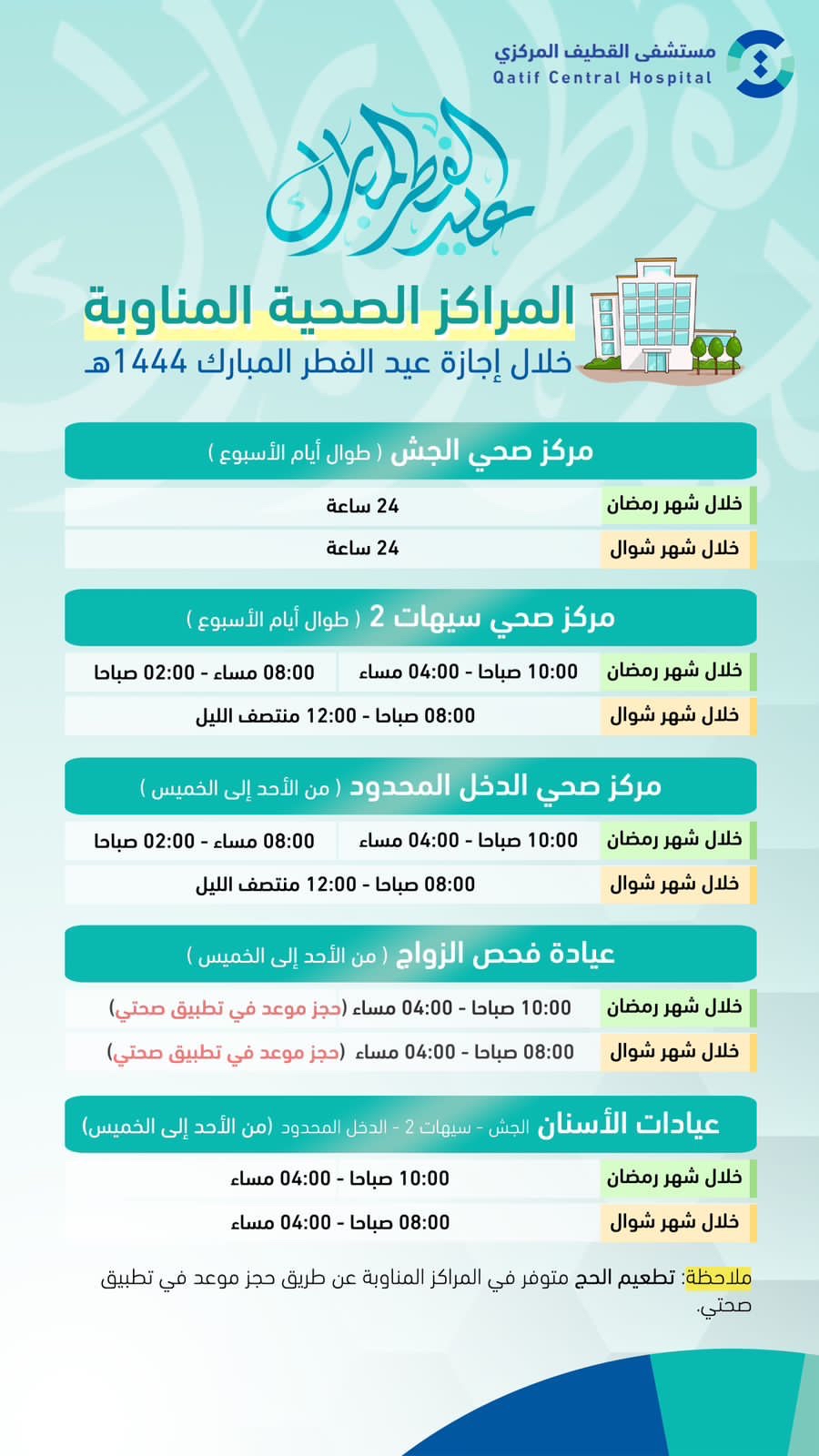 أعلنت شبكة القطيف الصحية، المراكز المناوبة خلال إجازة عيد الفطر المبارك، وشملت مركز صحي الجش، مركز صحي سيهات 2، ومركز الدخل المحدود.