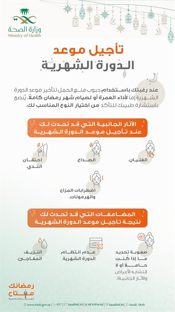 وأوصت النساءَ باستشارة الطبيب للتأكد من اختيار حبوب منع الحمل المناسبة، في حالة الرغبة بتأخير موعد الدورة الشهرية بغرض العمرة أو الصيام.