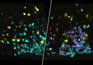 الصيام ينشط عصبونات ال AgRP في الدماغ. تظهر الصورة مناعة الخلايا العصبية من الفئران التي صامت لمدة أربع ساعات «على اليمين» والفئران التي لم تصم «على اليسار». عصبونات ال AgRP «الملونة باللون السماوي»، عصبونات ال POMC «للون الأصفر» وعلامة النشاط المشبكي «cFOS، أرجواني».