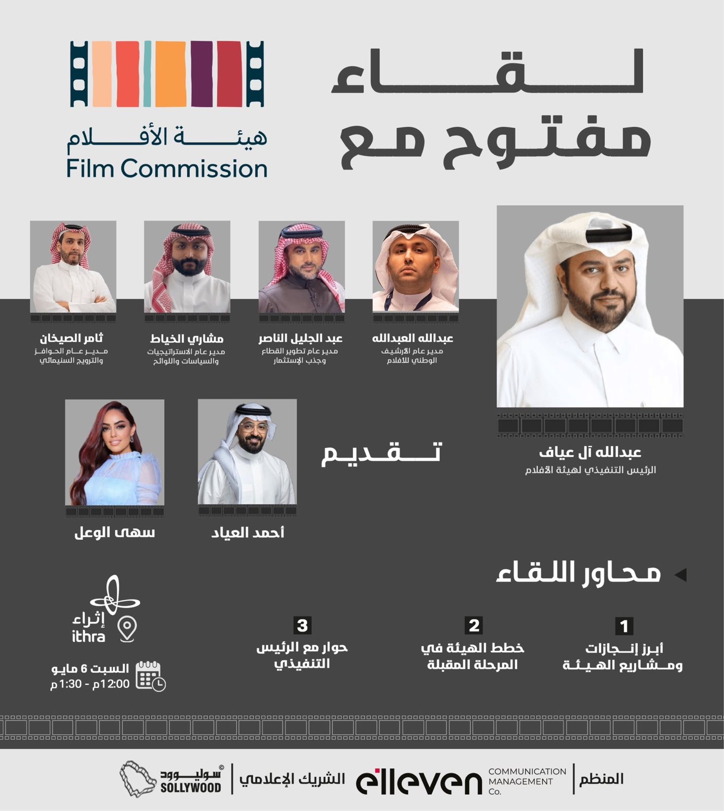 ويتضمن اللقاء حديثًا مفتوحًا مع الرئيس التنفيذي لهيئة الأفلام م. عبدالله آل عياف، يتبعه استعراض لأبرز الإنجازات والخطط المستقبلية للهيئة، يتضمن ذلك استعراض أبرز جهود الهيئة وطموحاتها في الترويج لصناعة الأفلام وتحفيزها.