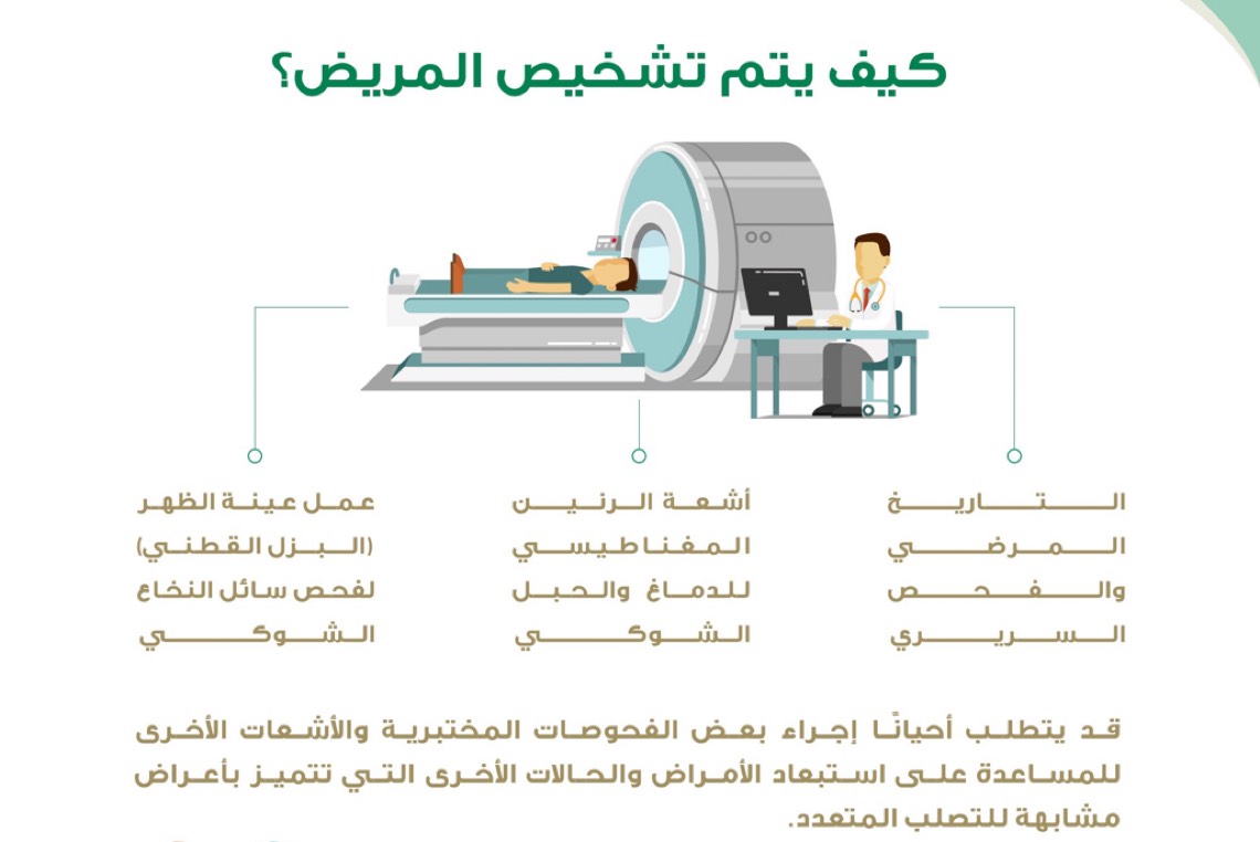 وأوضحت الصحة الشرقية عبر حسابها الرسمي على موقع التواصل الاجتماعي ”تويتر“، أن طرق تشخيص المرض تتضمن التاريخ المرضي والفحص السريري، وأشعة الرنين المغناطيسي للدماغ والحبل الشوكي، وعمل عينة الظهر ”البزل القطني“ لفحص سائل النخاع الشوكي.