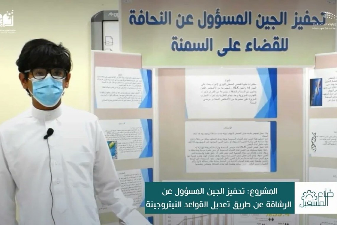 استعرض الطالب ”علي آل هلال“، من مدرسة البحتري المتوسطة بأم الحمام بالقطيف، مشروعه في مجال الأحياء والعلوم الحيوية، تحت عنوان ”تحفيز الجين المسؤول عن الرشاقة عن طريق تعديل القواعد النيتروجينية، ومن ثم القضاء على السمنة“.