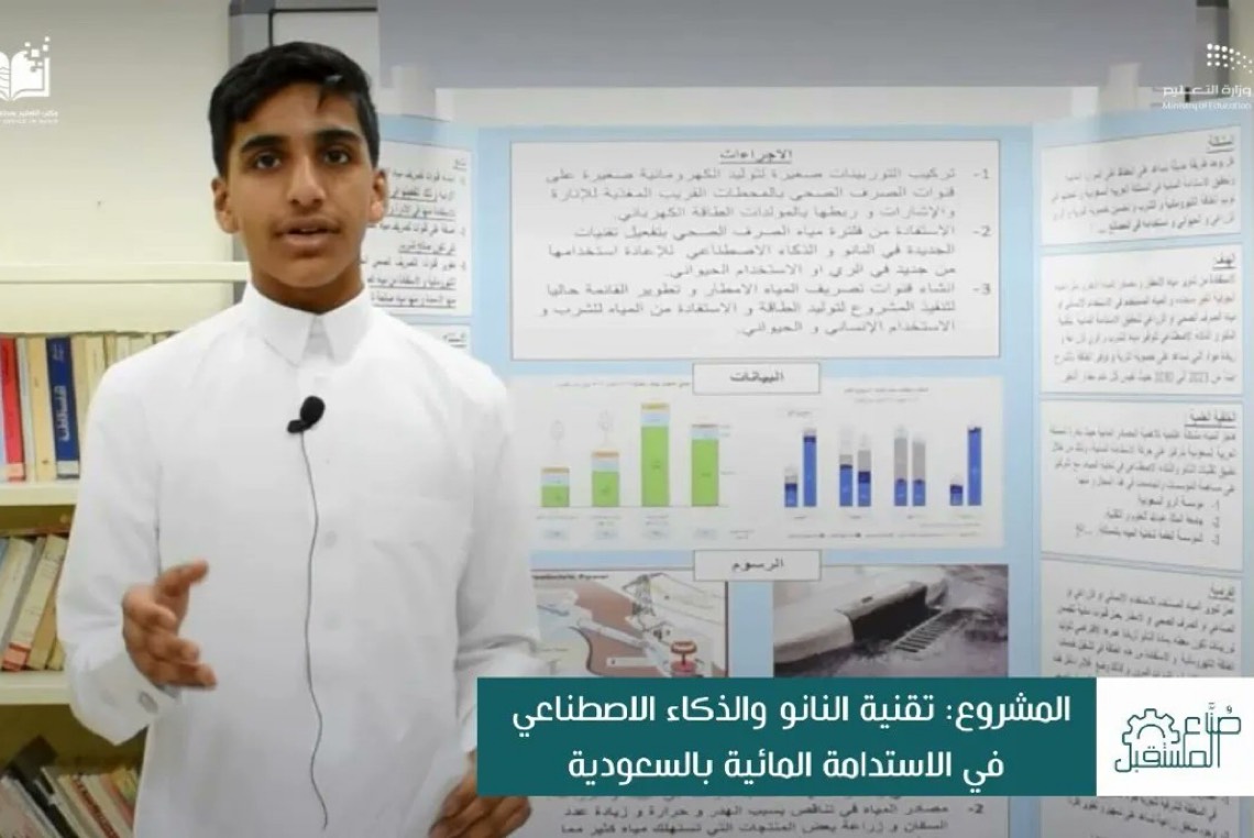 استعرض الطالب ”علي الشرفاء“، من مدرسة القطيف المتوسطة، مشروعه في مجال البيئة تحت عنوان ”تقنية النانو والذكاء الاصطناعي في الاستدامة المائية بالسعودية“.