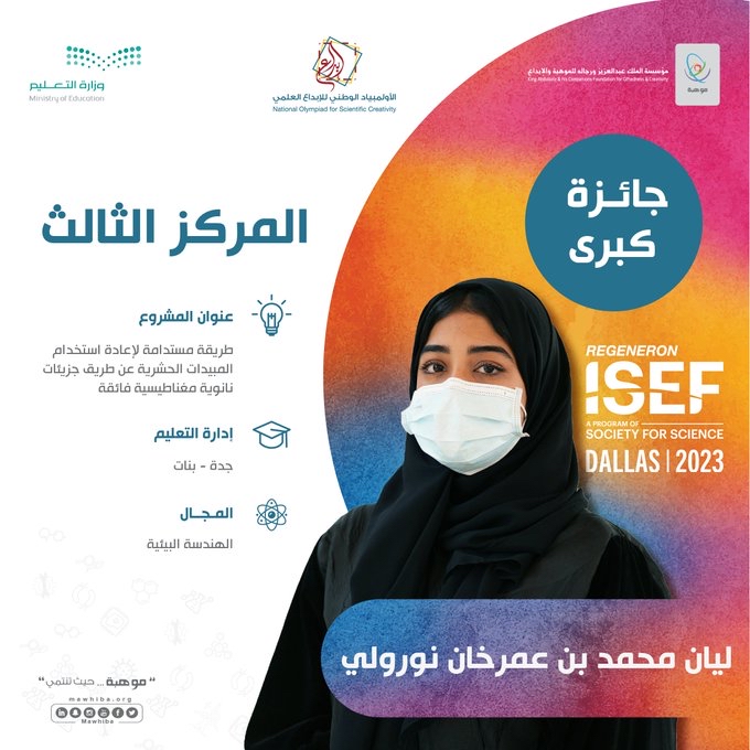ونالت الطالبة ليان نورولي بإدارة تعليم جدة المركز الثالث في مجال الهندسة البيئية عن مشروعها النّوعي ”طريقة مستدامة لإعادة استخدام المبيدات الحشرية عن طريق جزيئات نانوية مغناطيسية فائقة“.