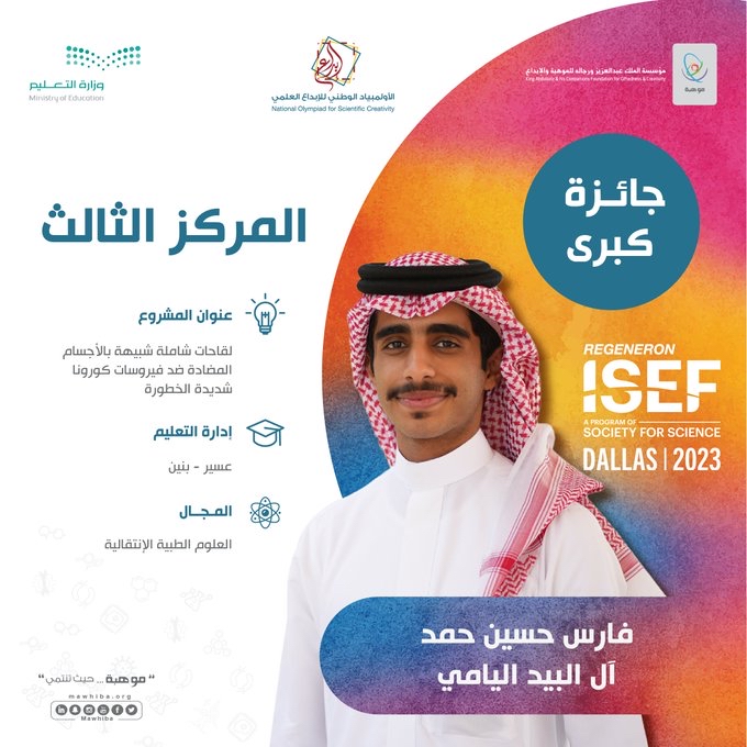 وفاز الطالب فارس اليامي بإدارة تعليم عسير بالمركز الثالث عن مشروعه النوعي ”لقاحات شاملة شبيهة بالأجسام المضادة ضد فيروسات كورونا شديدة الخطورة“ في مجال العلوم الطبية الانتقالية.