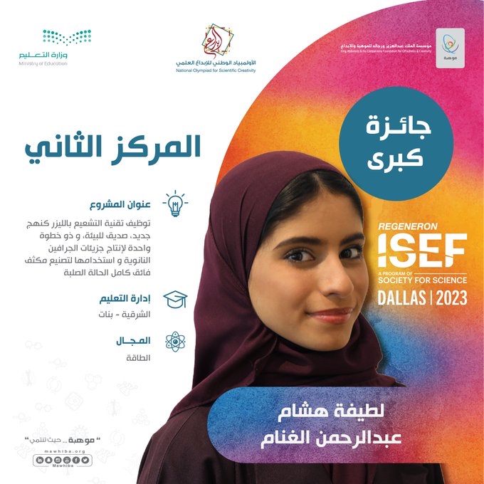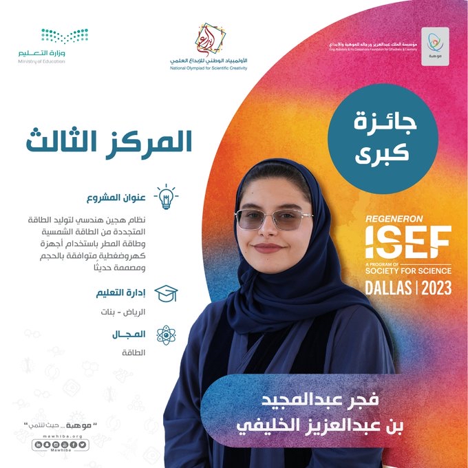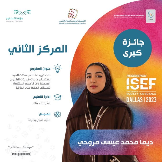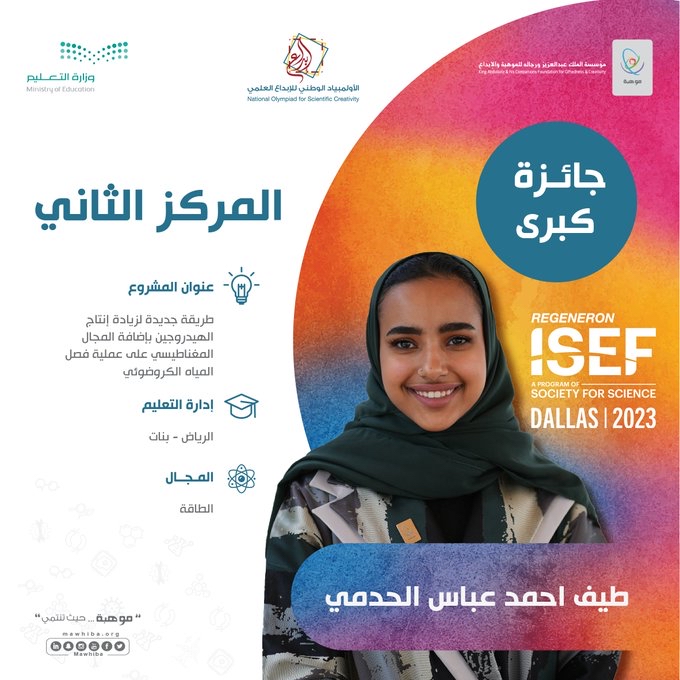 وظفرت الطالبة طيف الحدمي بإدارة تعليم الرياض بالمركز الثاني في مجال الطاقة، عن مشروعها النّوعي ”طريقة جديدة لزيادة إنتاج الهيدروجين بإضافة المجال المغناطيسي على عملية فصل المياة الكروضوئي“.