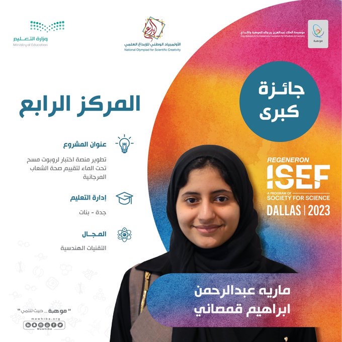 وفازت الطالبة ماريه قمصاني بإدارة تعليم جدة المركز الرابع في مجال التقنيات الهندسية عن مشروعها النوعيّ ”تطوير منصة اختبار لروبوت مسح تحت الماء لتقييم صحة الشعاب المرجانية“.