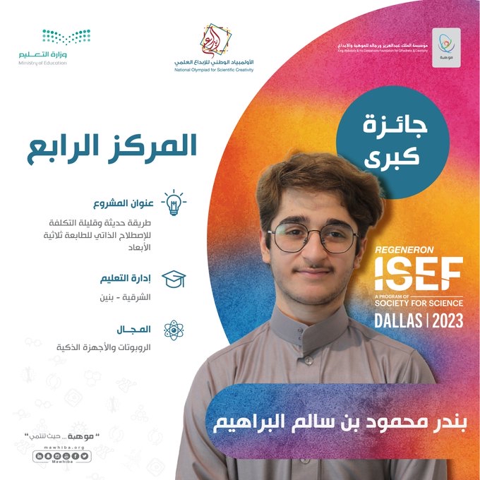 وحصد الطالب بندر البراهيم بإدارة تعليم الشرقية المركز الرابع في مجال الروبوتات والأجهزة الذكية عن مشروعه المميز "طريقة حديثة وقليلة التكلفة للإصطلاح الذاتي للطابعة ثلاثية الأبعاد.