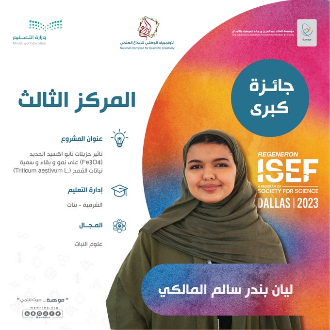 وحققت الطالبة ليان المالكي بإدارة تعليم الشرقية تحقق المركز الثالث في مجال علوم النبات عن مشروعها المُبهر ”تأثير جزيئات نانو أكسيد الحديد «Fe3O4» على نمو وبقاء وسمية نباتات القمح «Triticum aestivum L»“.