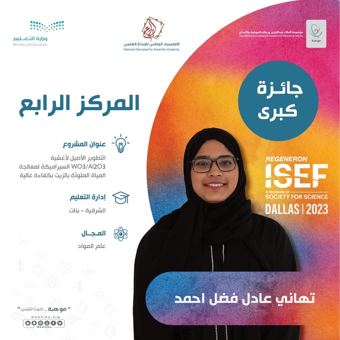 وتوّجت الطالبة تهاني أحمد بإدارة تعليم الشرقية المركز الرابع في مجال علم المواد عن مشروعها النوعيّ ”التطوير الأصيل لأغشية WO3/Al2O3 السيراميكة لمعالجة المياه الملوثة بالزيت بكفاءة عالية“.
