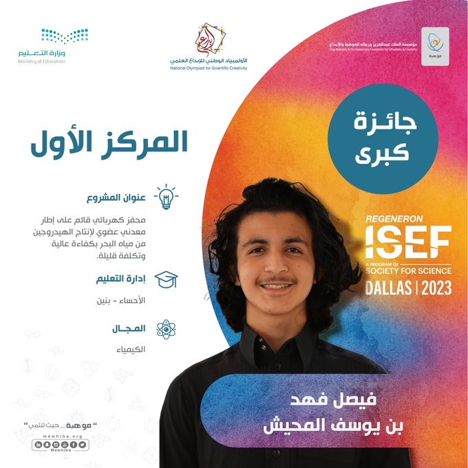 وظفر الطالب فيصل المحيش بإدارة تعليم الأحساء بالمركز الأول في مجال الكيمياء عن مشروعه المميز "محفز كهربائي قائم على إطار معدني عضوي لإنتاج الهيدروجين من مياه البحر بكفاءة عالية وتكلفة قليلة.