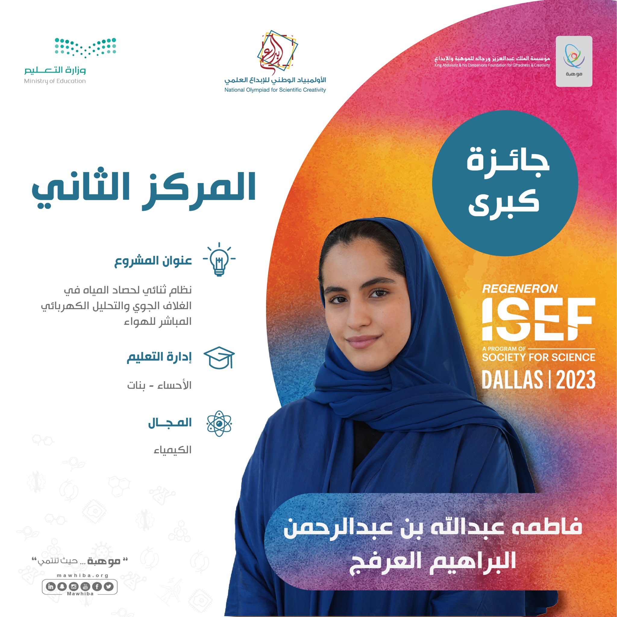 واقتنصت الطالبة فاطمة العرفج بإدارة تعليم الأحساء المركز الثاني في مجال الكيمياء عن مشروعها النوعي ”نظام ثنائي لحصاد المياه في الغلاف الجوي والتحليل الكهربائي المباشر للهواء“.