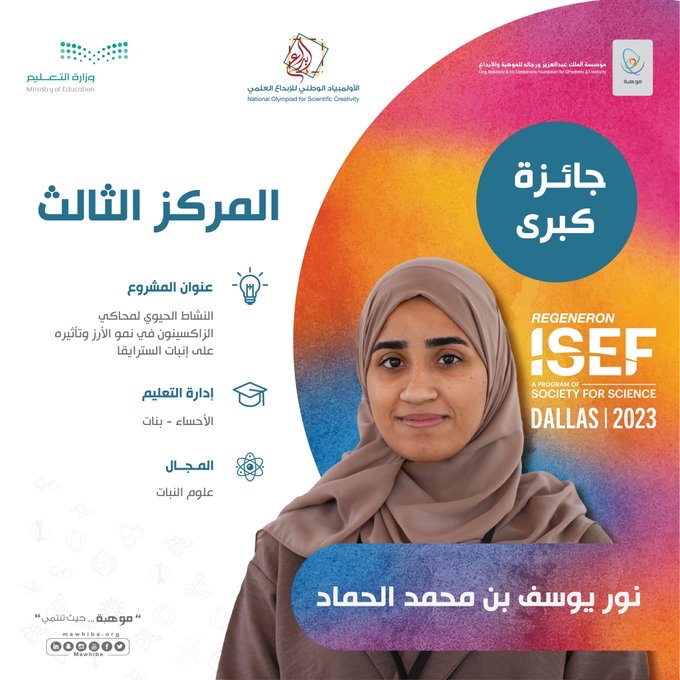 وفازت الطالبة نور الحماد بإدارة تعليم الأحساء بنات المركز الثالث في مجال علوم النبات عن مشروعها النّوعي "النشاط الحيوي لمحاكي الزاكسينون في نمو الأرز وتأثيره على إنبات السترايقا.