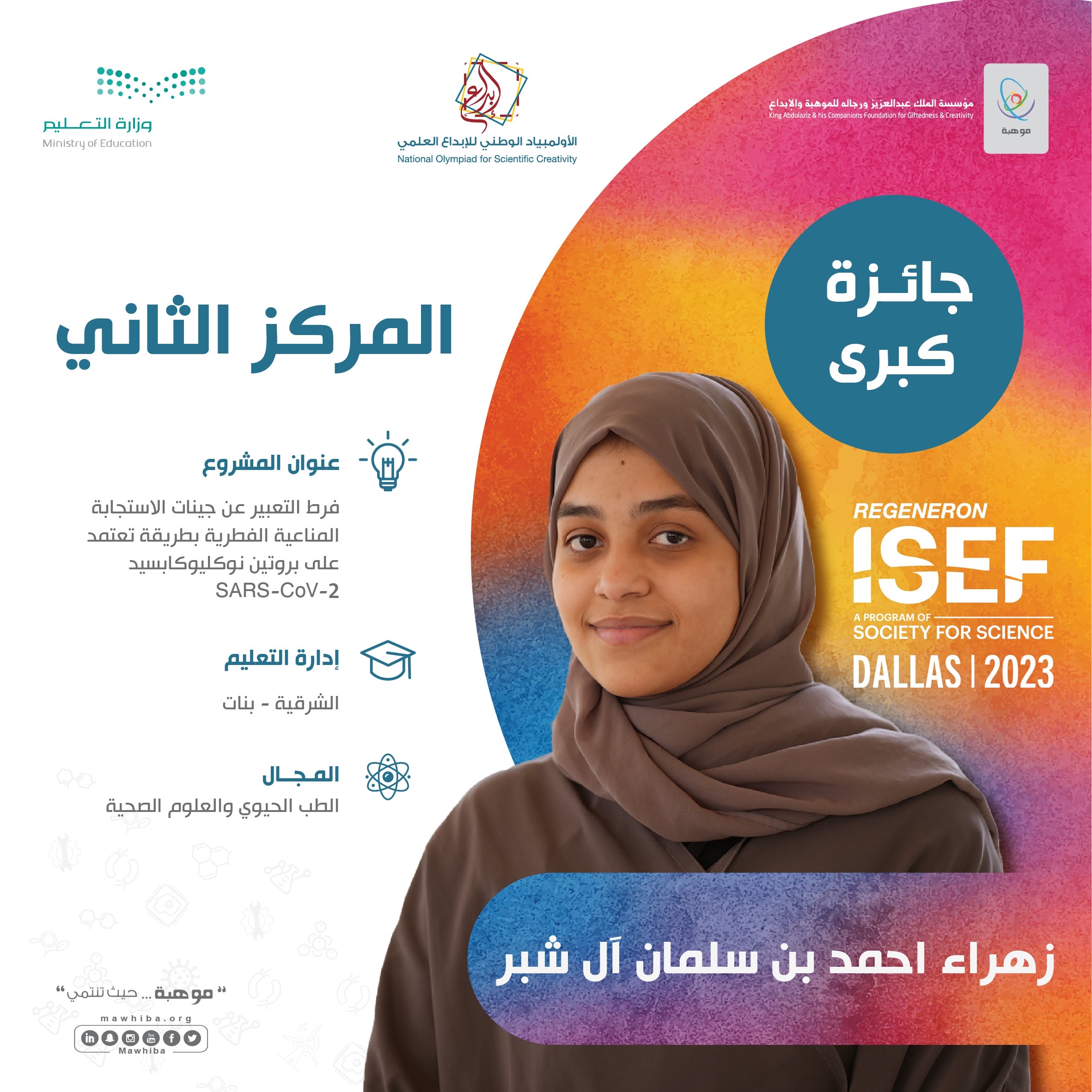 وحصلت الطالبة زهراء آل شبر بإدارة تعليم الشرقية على المركز الثاني في مجال الطب الحيوي والعلوم الصحية عن مشروعها النوعيّ ”فرط التعبير عن جينات الاستجابة المناعية الفطرية بطريقة تعتمد على بروتين نوكليوكابسيد SARS-CoV-2“.