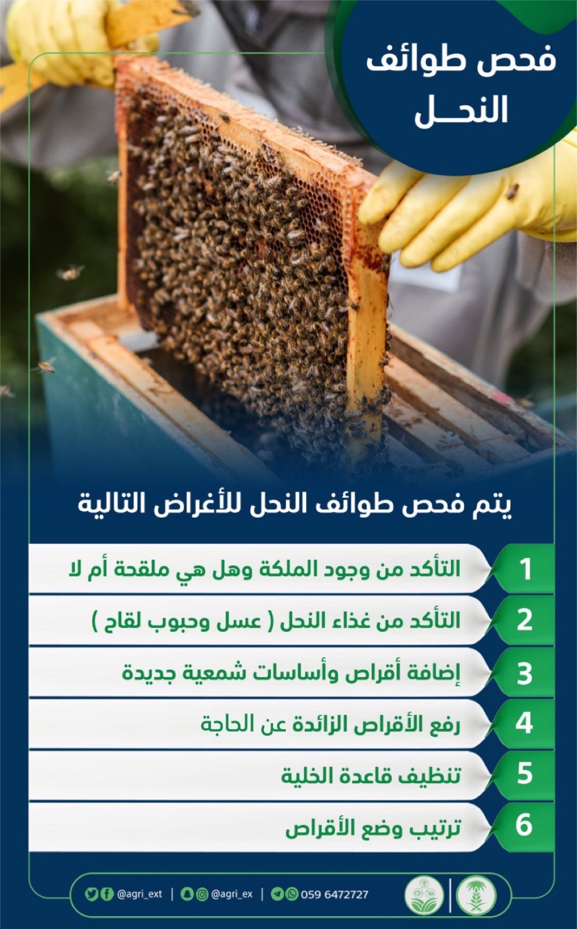 ونوه بضرورة التأكد من غذاء النحل «عسل وحبوب لقاح»، وإضافة أقراص أو أساسات شمعية جديدة، ورفع الأقراص الزائدة عن الحاجة، مع تنظيف قاعدة الخلية، وترتيب وضع الأقراص.