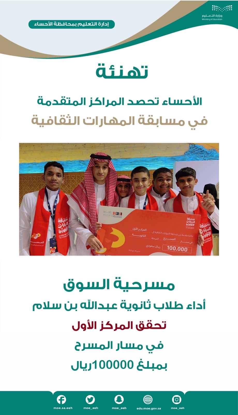 وقد هنأ مدير عام تعليم الأحساء حمد العيسى الفائزين، مُعبّرًا عن فخره بإنجازاتهم المذهلة. كما وجّه التهنئة لمنسقة مسابقة المهارات الثقافية، د. نوره الملحم، لحصولها على لقب فئة المنسقة المتميزة.