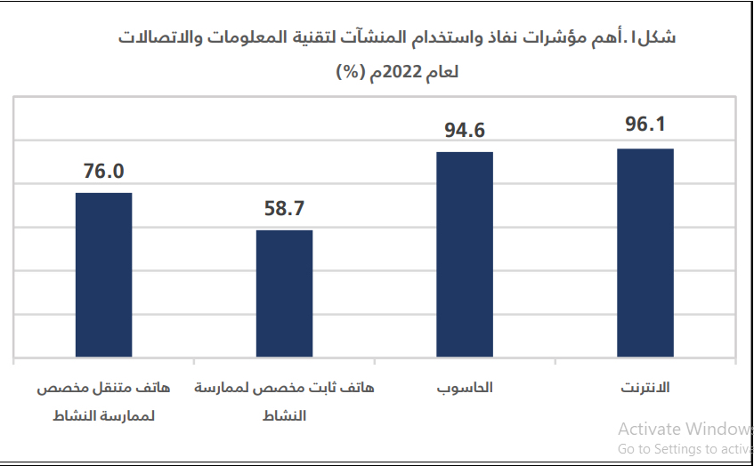 وذكرت الهيئة، في تقرير رسمي لها عن نتائج مسح نفاذ واستخدام تقنية المعلومات والاتصالات للمنشآت لعام 2022، أن أنشطة المعلومات والاتصالات كانت أكثر الأنشطة الاقتصادية للمنشآت استخدامًا للإنترنت، بنسبة 98,9 % تليها الأنشطة في مجال التعليم بنسبة 98,6 %، ثم الصناعات التحويلية.%97,6