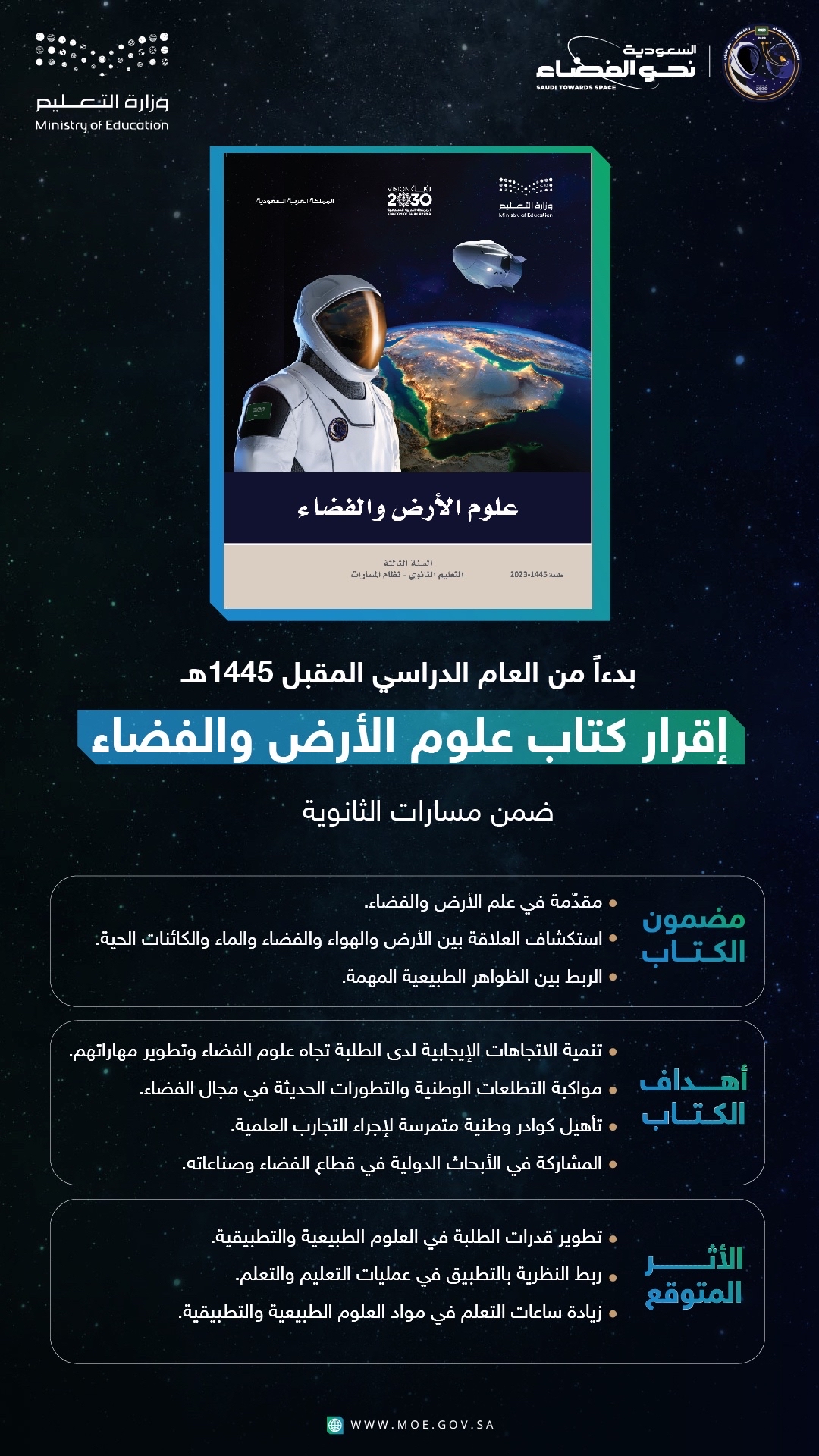 ويتيح كتاب «علوم الأرض والفضاء» للطلبة تطوير قدراتهم في العلوم الطبيعية والتطبيقية في المرحلة الثانوية، التي تشكل نحو 50% من مجالات التعلم في المسار العام ومسار علوم الحاسب والهندسة ومسار الصحة والحياة، من خلال ربط النظرية بالتطبيق في عمليات التعليم والتعلم، وزيادة ساعات التعلم في مواد العلوم الطبيعية والتطبيقية، إلى جانب تقديم مواد جديدة «علوم الأرض والفضاء، علم البيانات، الذكاء الاصطناعي، الأمن السيبراني، المجال الهندسي».