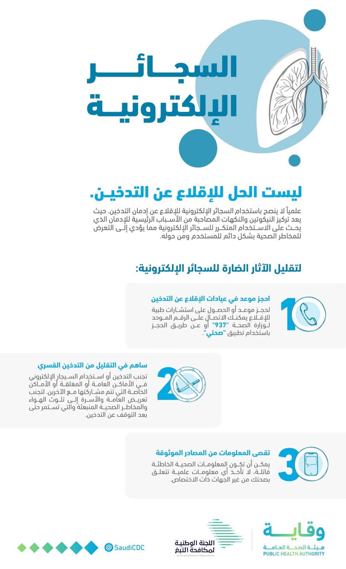 ونصحت «وقاية» بتقليل الآثار الضارة للسجائر الإلكترونية من خلال احجز موعد في عيادات الإقلاع عن التدخين لحجز موعد أو الحصول على استشارات طبية للإقلاع يمكنك الاتصال على الرقم الموحد لوزارة الصحة ”937“ أو عن طريق الحجز باستخدام تطبيق ”صحتي“.