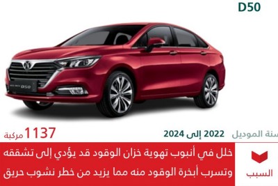استدعت وزارة التجارة 1,137 مركبة من طراز ”بايك D50“ للموديلات من 2022 إلى 2024، وذلك بعد رصد عيوب تصنيعية خطيرة قد تهدد سلامة الركاب ومستخدمي الطريق. وأوضحت الوزارة أن سبب الاستدعاء يكمن في وجود خلل فني في أنبوب تهوية خزان الوقود، حيث تبينت احتمالية تعرضه للتشقق، مما يؤدي إلى تسرب أبخرة الوقود وارتفاع مؤشرات خطر الاشتعال ونشوب حريق لا قدر الله. وطالبت الوزارة ملاك هذا الطراز بالتحقق العاجل من شمول أرقام... |