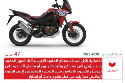 استدعت وزارة التجارة 47 دراجة نارية من طراز ”هوندا CRF1100“ لموديلات الأعوام الخمسة الأخيرة ”2020 - 2025“، محذرة من خلل تقني في منظومة الأسلاك قد يؤدي إلى تعطيل وظائف السلامة الأساسية ويزيد من احتمالية وقوع حوادث مرورية، داعية الملاك للتوجه الفوري للإصلاح المجاني. وكشفت الوزارة عن تفاصيل العيب المصنعي المتمثل في احتمالية تآكل أسلاك مفتاح المقود الأيسر عند تدوير المقود، مما يسفر عن فشل وظيفي مفاجئ يفقد السائق القدرة على استخدام... |