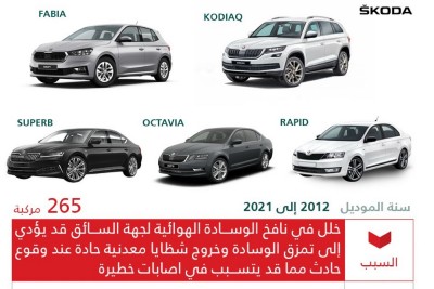 استدعت وزارة التجارة 265 مركبة من طرازات ”سكودا“ المتنوعة، محذرة من خلل تقني خطير قد يحول وسيلة الأمان إلى مصدر تهديد مباشر لقائدي المركبات. وكشفت الوزارة عن مكمن الخطر المتمثل في عيب تصنيعي بنافخ الوسادة الهوائية المواجه للسائق، والذي يهدد سلامته بشكل مباشر في حال وقوع الحوادث. وأوضحت ”التجارة“ أن هذا الخلل قد يؤدي إلى تمزق الوسادة الهوائية بشكل مفاجئ، مما يتسبب في انطلاق شظايا معدنية حادة قد تُحدث إصابات خطيرة جداً... |