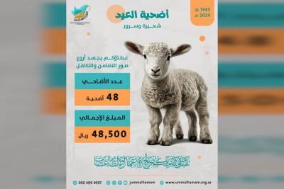 ?باشرت اللجنة الاجتماعيّة بجمعيّة أمّ الحمام الخيريّة، توزيع لحوم الأضاحي لسنة 1445 هـ، التي بلغ عددها 48 أضحية، على مستحقّيها من الفقراء والمحتاجين وعوائل أسر الأيتام المستفيدين من خدمات الجمعيّة. وبلغ إجمالي المبلغ المحصّل للبرنامج 48,500 ريال، تمّ تحصيلها عبر موقع جمع التبرّعات الإلكترونيّ للجمعيّة، ومن خلال مكتب التحصيل، وذلك خلال أسبوعٍ واحدٍ فقط من إطلاق البرنامج. وهدف البرنامج إلى إدخال الفرح والبهجة في نفوس الأسر المستفيدة، وتخفيف جزءٍ من الأعباء الماليّة... |