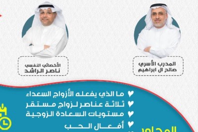 ينظم مركز سنا للإرشاد الأسري التابع لجمعية البر الخيرية بسنابس، البرنامج التثقيفي ”كيف تحقق زواجًا ناجحًا“. يهدف البرنامج الذي يستهدف المتزوجين والمقبلين على الزواج من كلا الجنسين للحضور ويقام على مدار يومي الثلاثاء والأربعاء 7 - 8 شوال 1445ه، إلى تثقيف الأزواج وتطوير مهاراتهم الزوجية لخلق حياة زوجية سعيدة ومستقرة. ويقدم البرنامج المرشد الأسري الشيخ صالح آل إبراهيم والاختصاصي النفسي ناصر الراشد، مُتطرقين إلى العديد من المواضيع الهامة، تشمل: - ما الذي يفعله... |