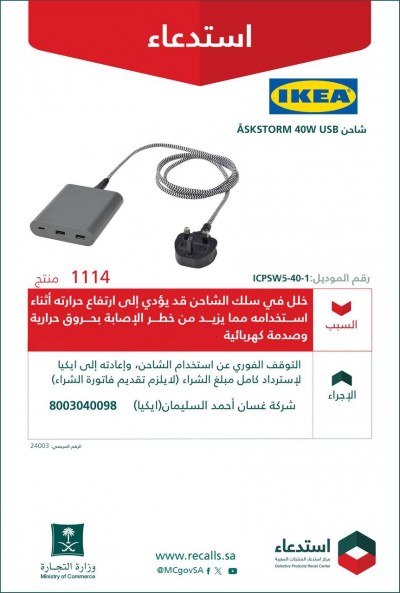 أعلنت وزارة التجارة اليوم عن استدعاء 1114 شاحنًا من شركة ”إيكيا“ السويدية، لاحتمالية تسببه بصدمة كهربائية. وأوضحت الوزارة أن سبب الاستدعاء هو وجود خلل في السلك يتسبب في ارتفاع حرارته مما يزيد خطر حدوث الصدمة الكهربائية ونشوب حريق. وتأتي هذه الخطوة ضمن جهود الوزارة لحماية المستهلكين وضمان سلامتهم. وتستخدم شواحن Askastorm 40w USB المستدعاة في العديد من الهواتف الذكية والأجهزة اللوحية وأجهزة الشحن الأخرى. وحذرت الوزارة المستهلكين من استخدام هذه الشواحن، داعية إلى إعادتها... |
