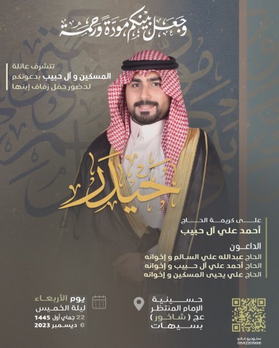 يحتفل الزميل في صحيفة جهات الإخبارية الشاب حيدر علي المسكين، بزفافه على الشابة جنى أحمد آل حبيب الزميلة في الصحيفة، يوم الأربعاء - ليلة الخميس - السادس من ديسمبر، في حسينية شاخور بسيهات، وسط فرحة الأهل والأصدقاء ومحبي العريسين. أسرة ”جهات الإخبارية“ تتقدم بأسمى التهاني والتبريكات للعريسين وعائلتيهما، سائلة الله تعالى أن يبارك لهما ويوفقهما في حياتهما الزوجية، وأن يرزقهما الذرية الصالحة.... |