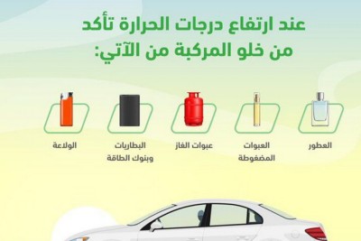شددت الإدارة العامة للمرور على أهمية الحفاظ على سلامة المركبات خلال فصل الصيف، وذلك من خلال التأكد من خلوها من المواد القابلة للتفاعل مع الحرارة، التي تشكل خطراً على السلامة العامة وتزيد من احتمالية وقوع حوادث الانفجار والحرائق. ونشرت الإدارة عبر حسابها الرسمي على موقع التواصل الاجتماعي ”تويتر“ مقطع فيديو يوضح المواد التي يجب التحقق من خلوها من المركبة، والتي تشمل العبوات المضغوطة، وزجاجات العطور، وأسطونات الغاز، البطاريات وبنوك الطاقة، الأجهزة... |