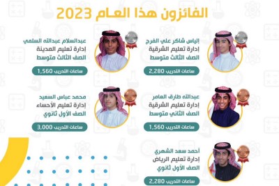 ظفر 5 طلاب من طلبة مؤسسة الملك عبدالعزيز ورجاله للموهبة والإبداع ”موهبة“ ب 5 ميداليات في أولمبياد البلقان للناشئين للرياضيات 2023 «JBMO2023»، المقام في ألبانيا - تيرانا. وحصل الفريق السعودي على فضيتان و3 برونزيات، من بينهم 3 طلاب من الشرقية. وشارك في هذه النسخة من أولمبياد الرياضيات 115 طالباً وطالبةً يمثلون 19 دولةً. ومن بين الفائزين. وحقق الطالب إلياس الفرج من الشرقية ميدالية فضية بعد تدربه 2280 ساعة، وعبدالسلام السلمي من المدينة... |