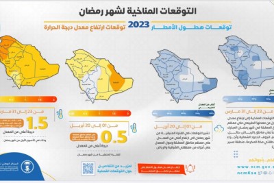 أصدر المركز الوطني للأرصاد تقريره الخاص بالملامح المناخية لشهر رمضان المبارك خلال الفترة من 23 مارس إلى 20 أبريل 2023م، حيث تقع هذه الفترة خلال فصل الربيع أرصاديًا. وأوضح التقرير أنه من المتوقع، بمشيئة الله تعالى، ارتفاع معدل درجة الحرارة في شهر رمضان على معظم مناطق المملكة. وأشار إلى ارتفاع معدل درجات الحرارة السطحية بمقدار يصل أعلاه إلى درجة ونصف خلال شهر مارس وخاصة على مناطق «تبوك، أجزاء من الحدود الشمالية والجوف». كما ... |
