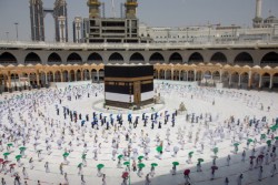 بالصور.. الحجاج يؤدون طواف القدوم والسعي وسط تباعد جسدي