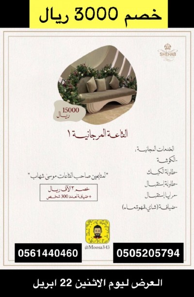 ”قصور شهاب للافراح“ خصم 3000 ريال على المرجانية العرض ليوم الاثنين 22 ابريل رقم الحجوزات: 0505205794 واتساب: 0561440460 |