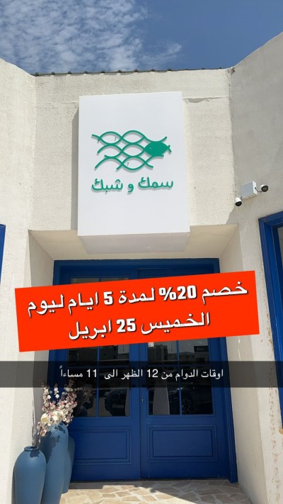 خصم 20 ٪ لدى ”سمك وشبك“ تستمر ليوم الخميس 25 ابريل الانستغرام: https://www.instagram.com/samak_w_shabak موقعنا: المجيدية - شارع القدس... |