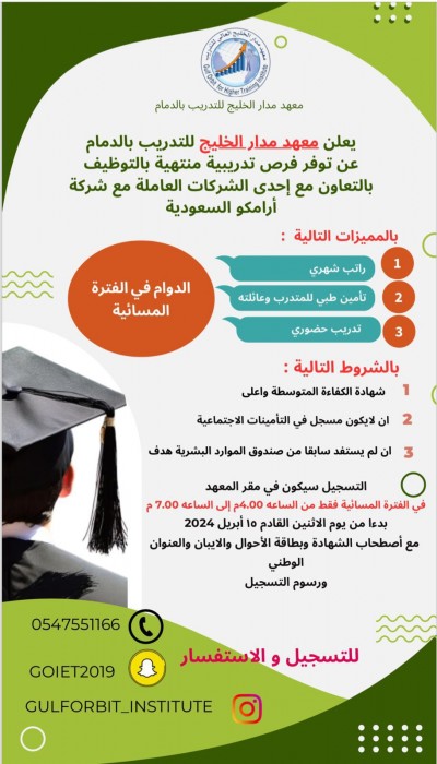 ”معهد مدار الخليج العالي“ للتدريب يعلن عن توفر فرص تدريبية منتهي بالتوظيفة مع الشركات العاملة مع شركة أرامكو يحصل المتدرب أو المتدربة على العديد من المزايا مثل: راتب شهري 4000 ريال تأمين طبي التسجيل في التأمينات الاجتماعية التسجيل مستمر لـ 15 مايو أو حتى إكتمال العدد الانستغرام: ... |