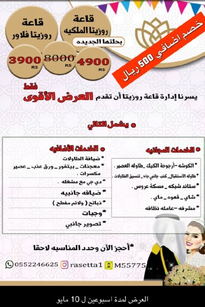 قاعة ”روزيتا الملكية“ المجيدية بالحلة الجديدة عرض خورافي بـ 3900 ريال وخصم إضافي 500 ريال احجز الآن وحدد المناسبة لاحقا السناب: https://t.snapchat.com/C7vUV4XP الانستغرام: https://instagram.com/rasetta1 ... |