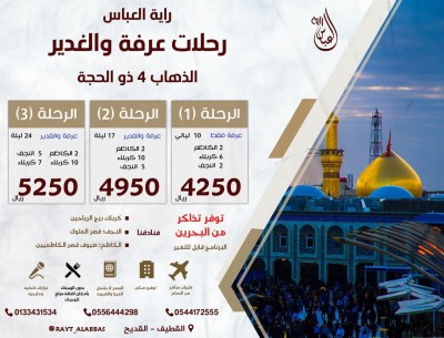 سارع في حجز مقعدك في رحلات عرفة والغدير لزيارة الأئمة الأطهار عليهم السّلام في العراق مع حملة راية العباس 🛫 الذهاب 4 ذو الحجة ✨ الرحلة 1️⃣ | 10 ليال | عرفة فقط 2 | الكاظم 6 | كربلاء 2 | النجف 4250 ريال ... |