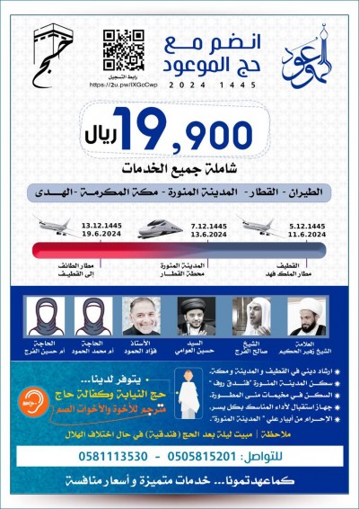 💺المقاعد الأخيرة مع 🕋 حج الموعود ✈️ رحلة إيمانية شاملة فقط ب 19900 🏢 فندق روف بالمدينة المنورة 🚆القطار من المدينة لمكة 🏠الخيام المطورة بمنى 🐑 الهدي 📝 دروس الإرشاد تبدأ الأربعاء: ... |
