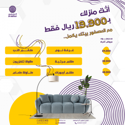 العصفور للاثاث الفاخر والذوق الرفيع يقدم لكم العصفور عروض البكجات الاربعه لتأثيث المنزل تبدأ من 19,900 ريال!! مكون من: 🟨 غرفة نوم 🟪 طقم كنب 🟨 طاولة طعام 🟪 طاولة تلفزيون ... |
