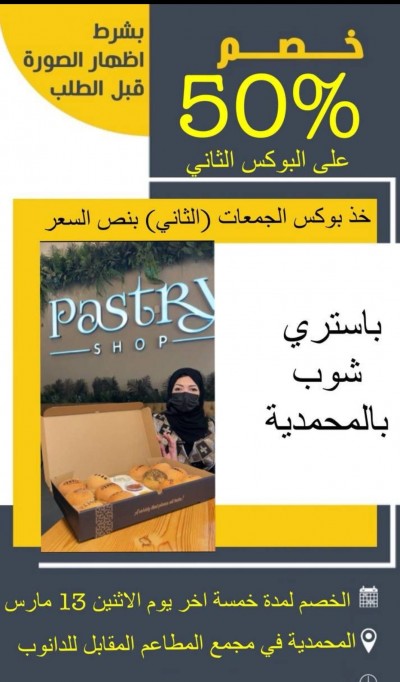 Pastry Shop ”باستري شوب“ خصم 20% على كامل المنيو خصم 50% على البوكس الثاني خصم 20% على المشروبات 📍 موقعنا: https://maps.app.goo.gl/XKMAzSwtqvKDRSVm8 الانستقرام: ... |