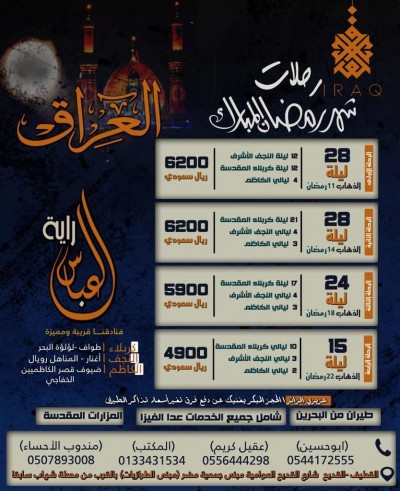 رحلات راية العباس للعراق خلال شهر رمضـان الذهاب 11 رمضان المدة: 28 ليلة 12 ليلة كربلاء 4 ليالي الكاظم 12 ليلة النجف السعر 6200 ريال ... |