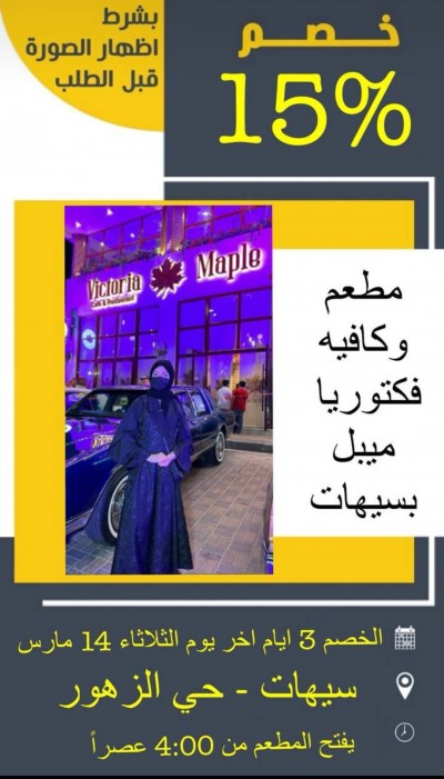 من كندا إلى سيهات.. ”القلاف“ يفتتح احدث مطعم وكافيه بسيهات ”Victoria Maple - فكتوريا ميبل“ تذوق طعم فريد من نوعه لأول مرة في المنطقة خصم 15% على كامل الفاتورة بمناسبة الافتتاح يتوفر ألعاب وتحديات في الدور الثاني من فكتوريا ميبل يفتح من الساعة الرابعة عصراً ... |