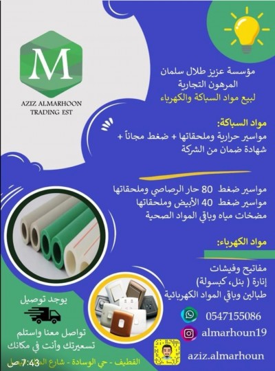 ”مؤسسة عزيز المرهون“ للمواد الصحية والكهربائية الموقع الالكتروني: https://aziz-almarhoon.com الانستغرام: https://instagram.com/almarhoun19 السناب شات: https://www.snapchat.com/add/aziz.almarhoun ... |