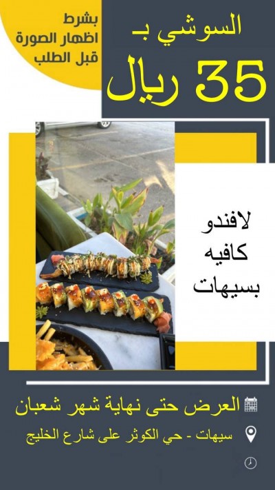 ”لافندو“خصم 20% السوشي بـ 35 ريال خصم 20% على كامل الفاتورة حلا وقهوة سعودية ⚠ العرض ينتهي نهاية شهر شعبان 📍 موقعنا : ... |