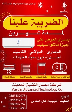 شركة مصدر التقنية الحديثة ”ماتكو“ خبرة أكثر من 30 سنة يسري لعرض لنهاية شهر مارس على أجهزة ماتكو السبليت «الجداري - الدولابي - الكاسيت - أجهزة تبريد مياه الخزانات» للتواصل: 0567557637 - 0543847319 موقعنا : شارع القدس - المجيدية. حي الشاطي .... |