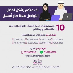 لخدمتكم بشكل أفضل التواصل معنا صار أسهل 10 من مسؤولي خدمة العملاء حاضرون للرد على مكالماتكم ورسائلكم 0535150303 - 0535150302 0535153313 - 0535053100 0501533303 - 0531501533 0508854774 - 0535153330 ... |