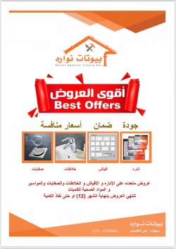بيوتات نوارة لمواد البناء والأدوات الصحية و المواد الكهربائية ومواد السباكة يميزنا: جودة - ضمان - آسعار تنافسية -إدارة سعودية لاتفوتك عروض متعددة على الانارة والافياش والخلاطات والصفايات والمواسير والمواد الصحية للكميات.. تنتهي العروض بنهاية شهر 12 أو حتى نفاذ الكمية. موقعنا: سيهات - شارع أبو موسى الانصاري..... |