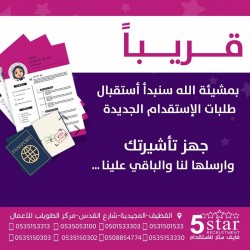 حاب تستقدم من فايف ستار؟ جهز تأشيرتك وأرسلها لنا وخل الباقي علينا .. لخدمتكم بشكل أفضل..التواصل معنا صار أسهل 10 من مسؤولي خدمة العملاء حاضرون للرد على مكالماتكم ورسائلكم 0535150303 - 0535150302 0535153313 - 0535053100 ... |